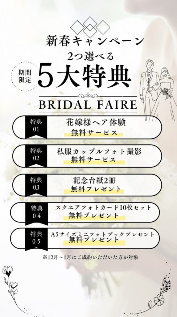12月〜1月の期間中にウェディングフォトをご成約いただいたお客様へ、人気の特典の中から“お好きな2つ”をお選びいただける特別フェアです。