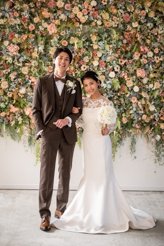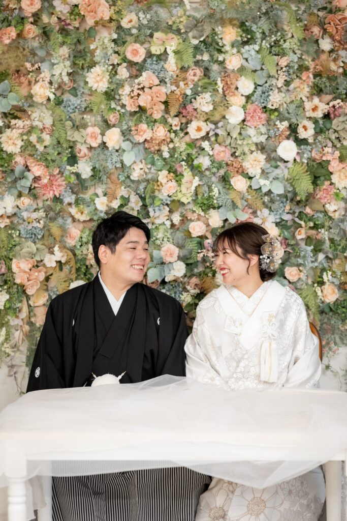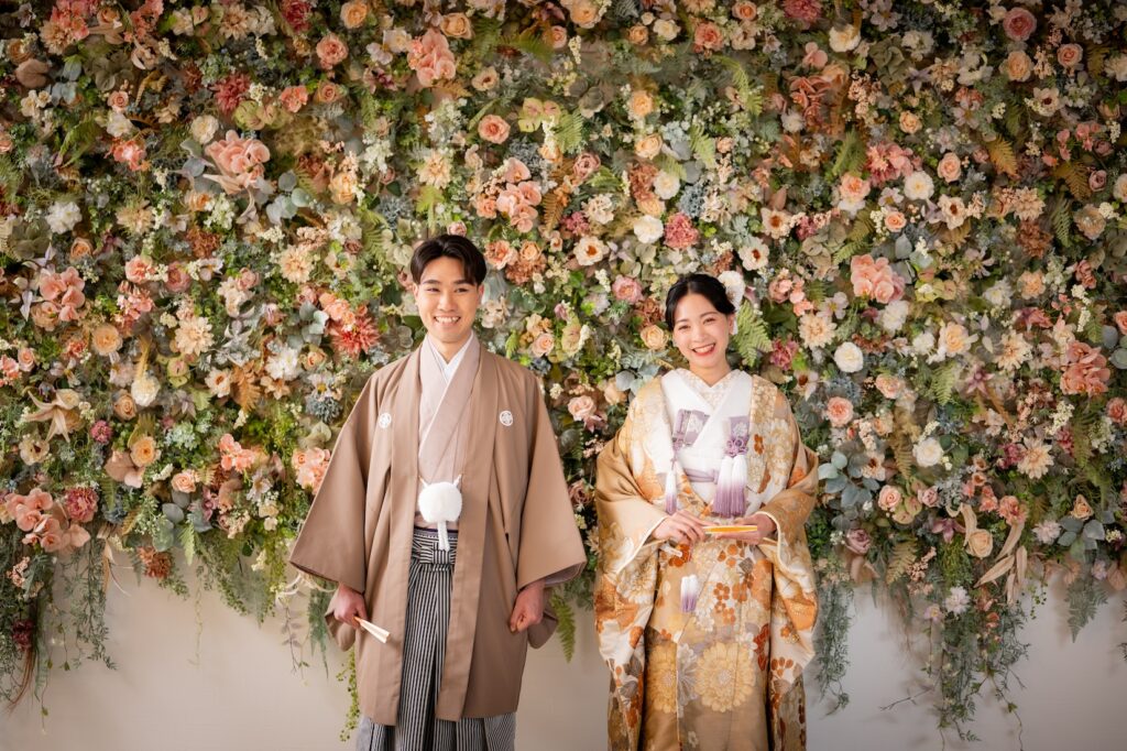この背景は、和装にもドレスにもどちらにもマッチするのが大きな魅力。白無垢や色打掛の和装フォトでは、花々の繊細な色味が衣装の美しさを際立たせ、ドレスウェディングでは、トレンド感と可愛らしさをプラスしてくれます♪