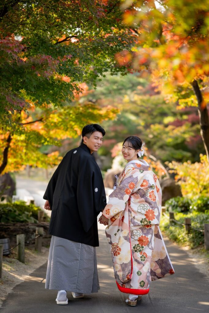 特に紅葉シーズンは園内全体が鮮やかな赤やオレンジに染まり、和装との相性は抜群!