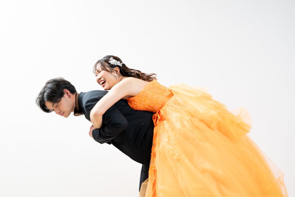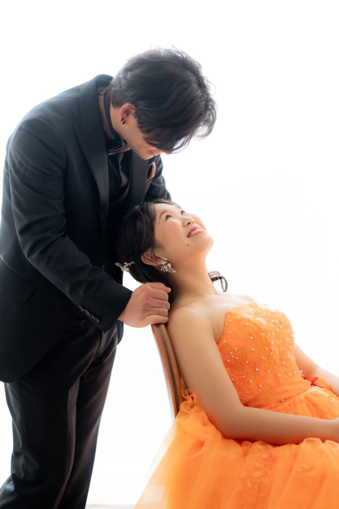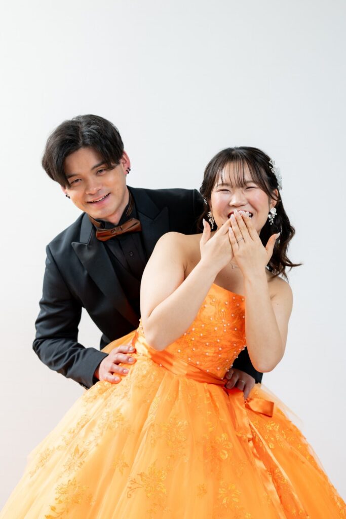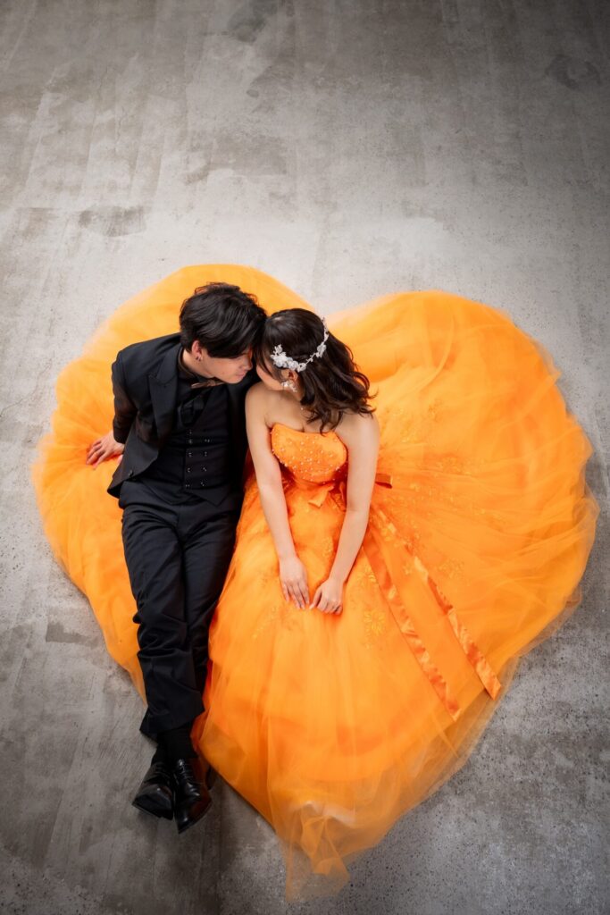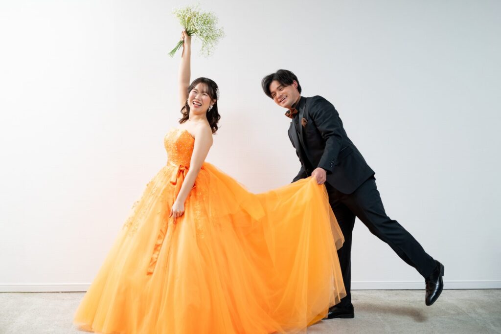 オレンジカラードレスで、秋の温かみと華やかさを感じながら、あなただけのカラードレスを残しませんか?特別な一日を、心から輝く姿で形にするお手伝いを致します!