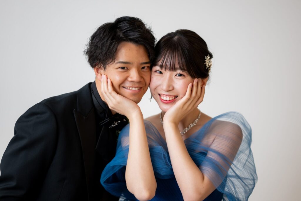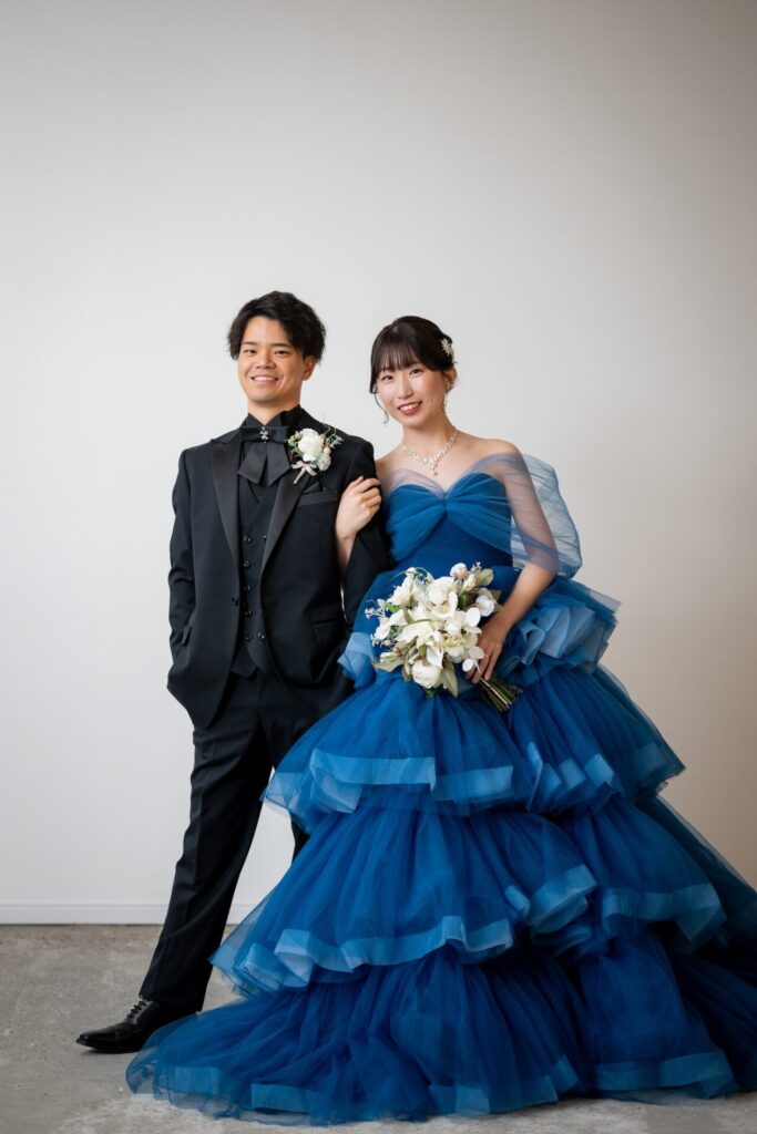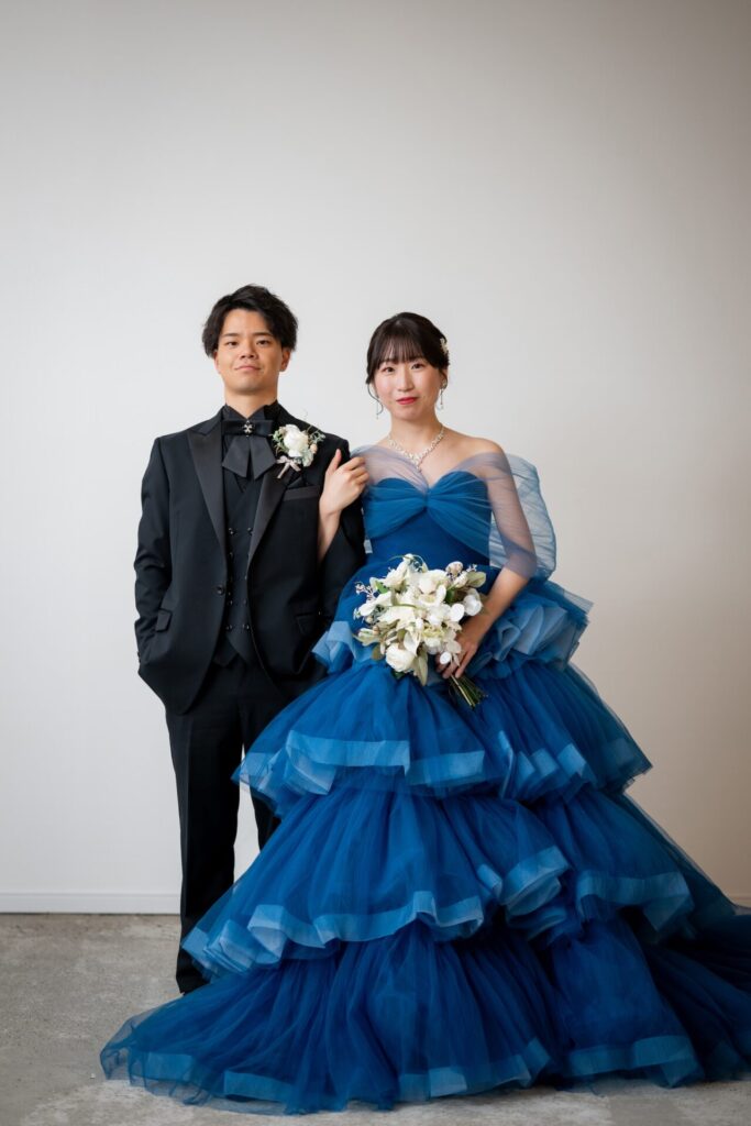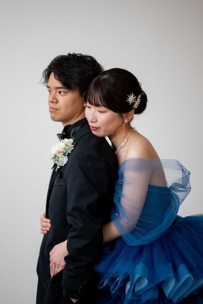 装飾がない、シンプルなスタジオ背景だからこそ、ドレスの色味やシルエット、新郎新婦様それぞれの存在感がしっかり引き立ちます。