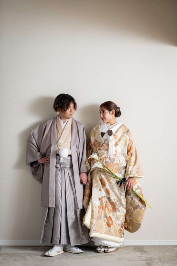 当店の色打掛は、トレンドのくすみカラーや淡色デザインなどもご用意。伝統でありながらも“今っぽく”おしゃれに着こなせるのが魅力です。重厚感のある古典柄から、透明感あふれるモダンなデザインまで、幅広いラインナップの中から、お好みや雰囲気に合わせてお選びいただけます。