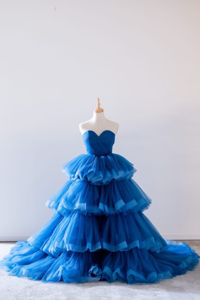 バックスタイルもふんわりと広がるチュールのレイヤーが美しく、どの角度から見ても立体感のあるシルエットが魅力。自然光が差し込シンプル背景では、ブルーの透明感がより一層際立ち、清楚で上品、それでいて華やかな印象を残します。