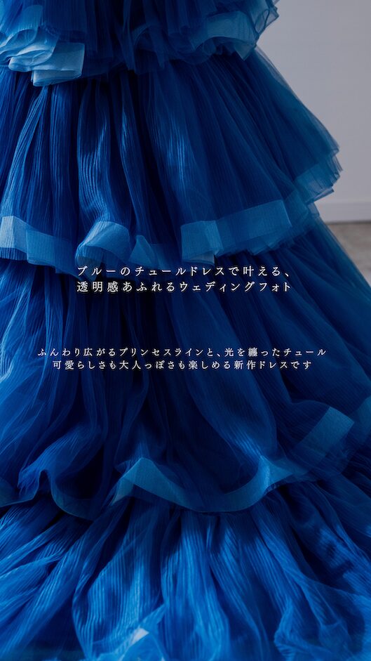バックスタイルもふんわりと広がるチュールのレイヤーが美しく、どの角度から見ても立体感のあるシルエットが魅力。自然光が差し込シンプル背景では、ブルーの透明感がより一層際立ち、清楚で上品、それでいて華やかな印象を残します。