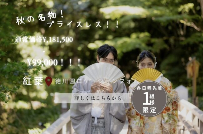 通常181,500円→99,000円(税込)名古屋を代表する人気ロケーション「徳川園」で、1日限りの特別キャンペーンを開催いたします!11月18日限定で、通常181,500円の徳川園フォトウ